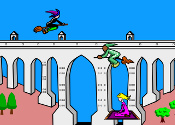 At the tower you can learn weather spells or watch flying broowstick races. If you succed, the weather spells game will award you 1 MQ point + 2 Penteuros. |